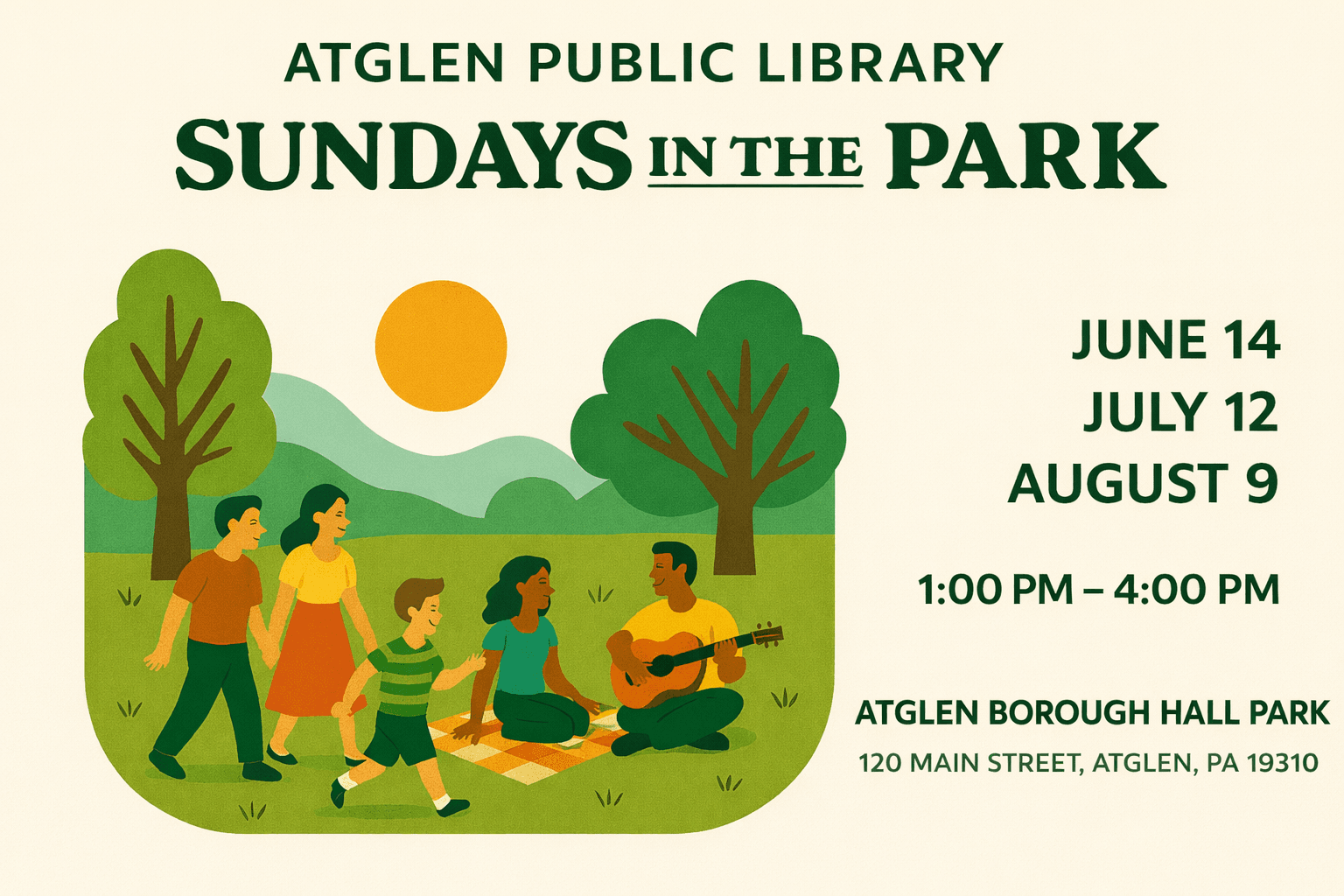 Atglen Public Library holds several events and fundraisers during the year. Look for Plant Swap & Share, Sundays in the Park, Atglen Community Day and Designer Purse Bingo.